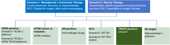 Salivary gland carcinomas (SGC) are rare, with limited prospective data and no standard or FDA-approved systemic therapy for recurrent/metastatic disease; gene-targeted precision therapy is emerging as a promising strategy. This report presents the preliminary results of ESG401 as a TROP2-targeted therapy for the treatment of salivary gland carcinoma (SGC).