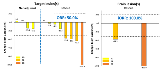 In the cohort of patients receiving ESG401 as neoadjuvant/transformational therapy, 4 subjects were evaluable for efficacy, with a disease control rate (DCR) of 100%. Among patients with salivary gland carcinoma receiving ESG401 as rescue therapy, 8 subjects were evaluable for efficacy, achieving an objective response rate (ORR) of 50% and a DCR of 100%.In 2 evaluable patients with brain metastases at baseline, the intracranial ORR reached 100%, with 1 patient achieving a complete response (CR).