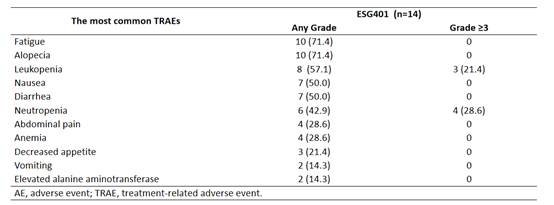 As of the cutoff date (Jan 22, 2025), 14 pts in the cohort received ≥1 dose of ESG401. The median age of the enrolled patients was 48.5 years (range: 31–65); there were 7 males and 7 females (50% each). At baseline, 43%, 7%, and 29% had lung, liver, and brain metastases, respectively. Seventy-nine percent of the patients had previously undergone surgery, 43% had received radiotherapy, 36% had received chemotherapy, and 14% had not received any prior treatment.