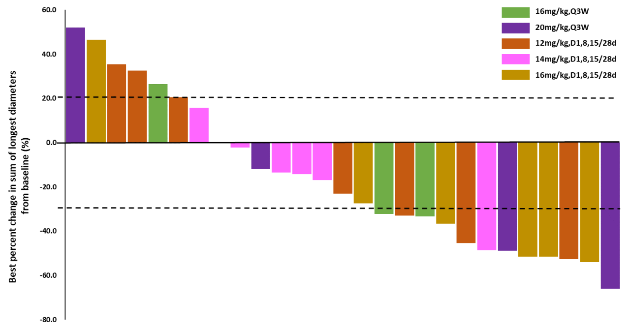 圖1.有效劑量組受試者靶病灶較基線的最佳變化百分比(%)