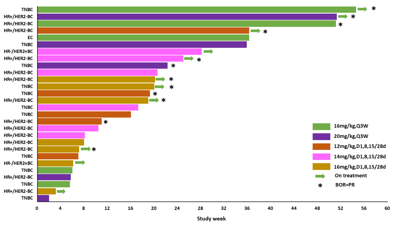 在33例療效可評(píng)估的受試者中,12例受試者達(dá)到PR,客觀緩解率(ORR)為36.4%,9例受試者達(dá)到SD(其中4例受試者達(dá)到持續(xù)≥24周的SD),DCR為63.6%。此外,最高劑量組的ORR為66.7%,DCR為83.3%;有效劑量TNBC患者的 ORR為36.3%,DCR為63.6%;有效劑量HR+/HER2-BC患者的 ORR為61.5%,DCR為76.9%。