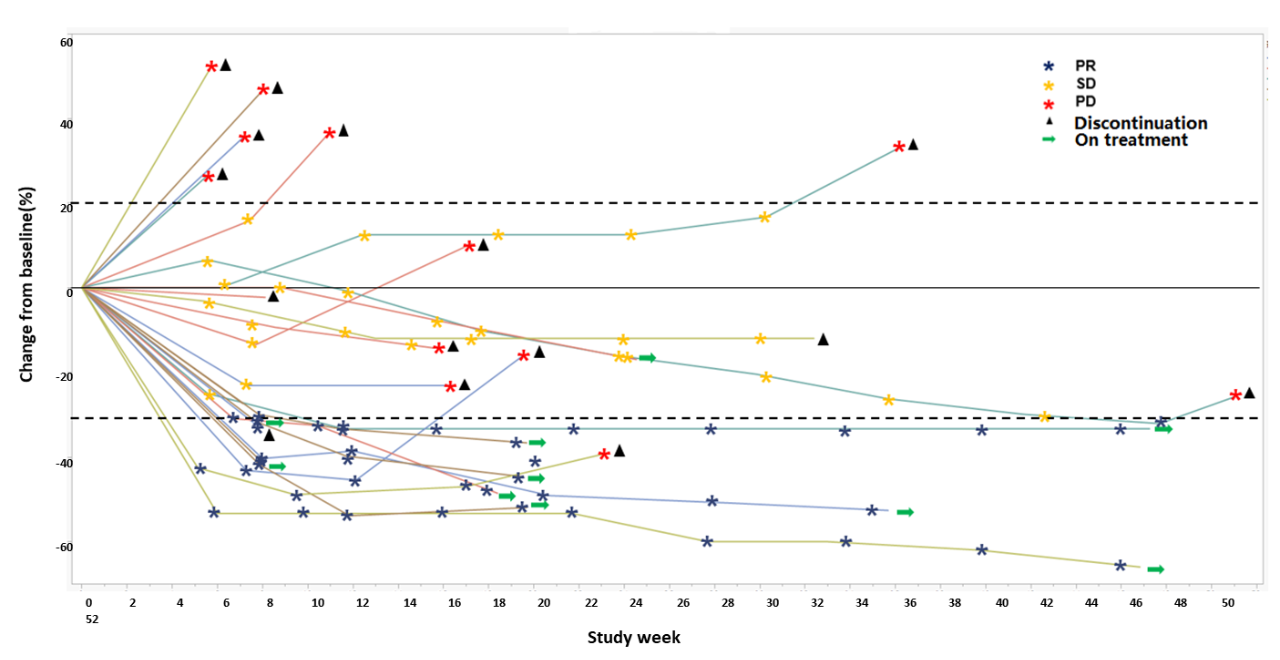 圖3.有效劑量組受試者靶病灶較基線變化百分比(%)